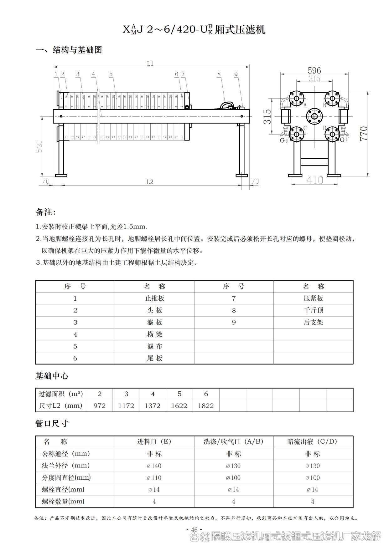 過濾麵積 m2 | 濾板數量 (塊) | 濾室 數量 (個) | 濾餅 厚度 mm | 濾室 容積 L | 外形尺寸 mm | 機器 質量 t | 進料管孔 直徑 mm | 出液孔直徑 | |||